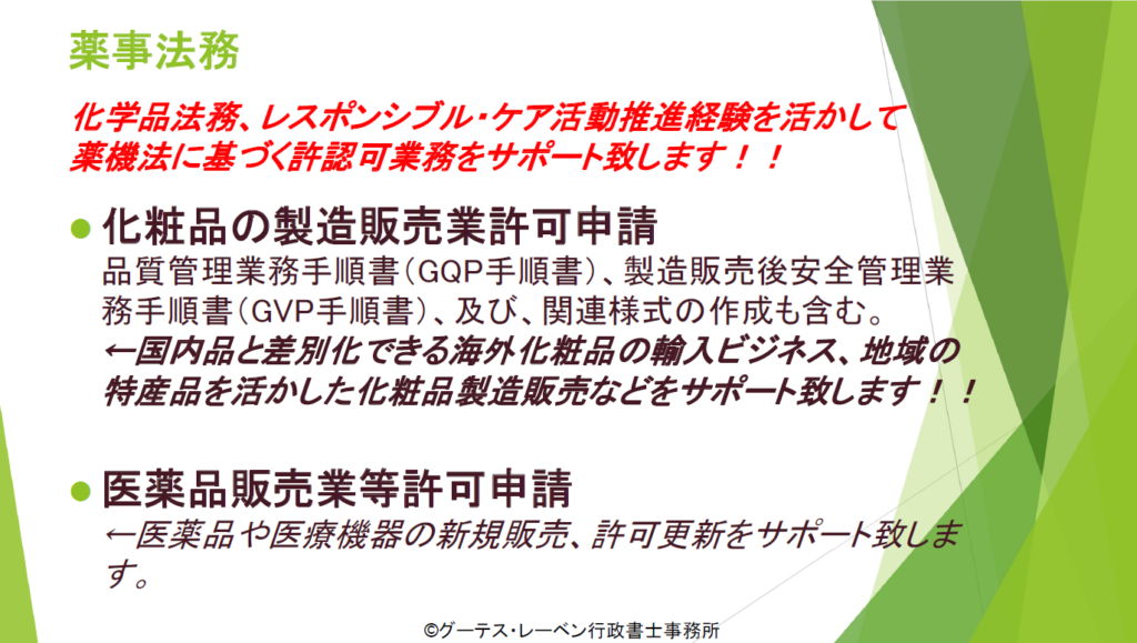 - 「医薬品、医療機器等の品質、有効性及び安全性の確保等に関する法律(薬機法)」に基づく、化粧品製造販売業の許可申請(業者コード登録、化粧品製造販売業、および、化粧品製造業許可申請、化粧品製造販売届)に関する書類作成、申請サポート。